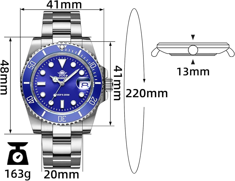 • Un gran reloj de buceo para hombres. Movimiento de cuarzo japonés MIYOTA, bisel giratorio unidireccional de ceramica acero inoxidable 316L premium, ventana de día de cristal reforzado con mineral con lupa sobresaliente de bisel, corona atornillada