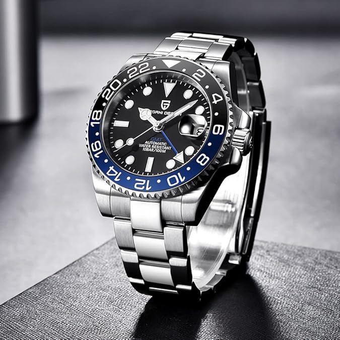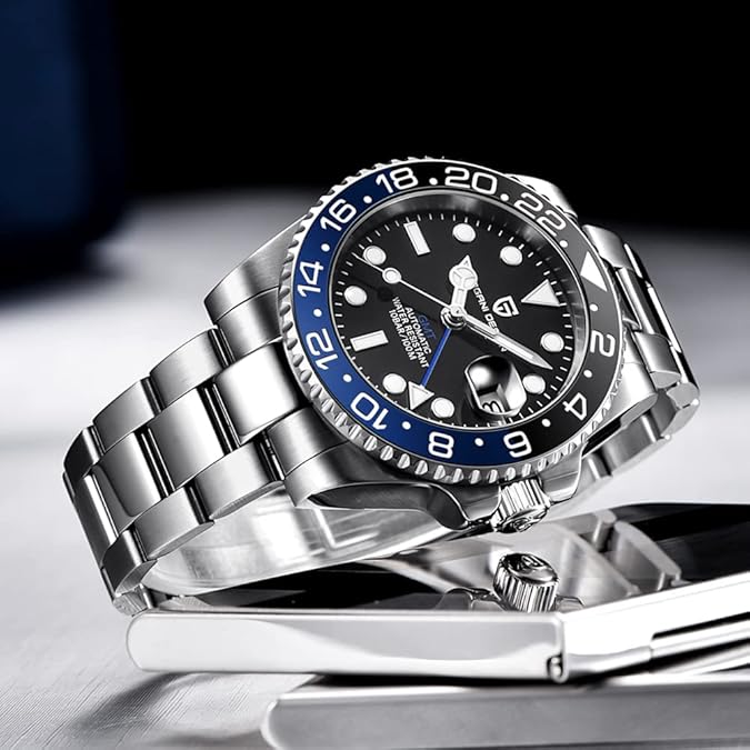 • Material del reloj: Cristal zafiro, resistente a los arañazos y relativamente suave. La correa de acero inoxidable es muy duradera. Y con la función GMT, el color puede combinar fácilmente con cualquiera de tus prendas. Perfecto para actividades diarias y actividades de negocios.