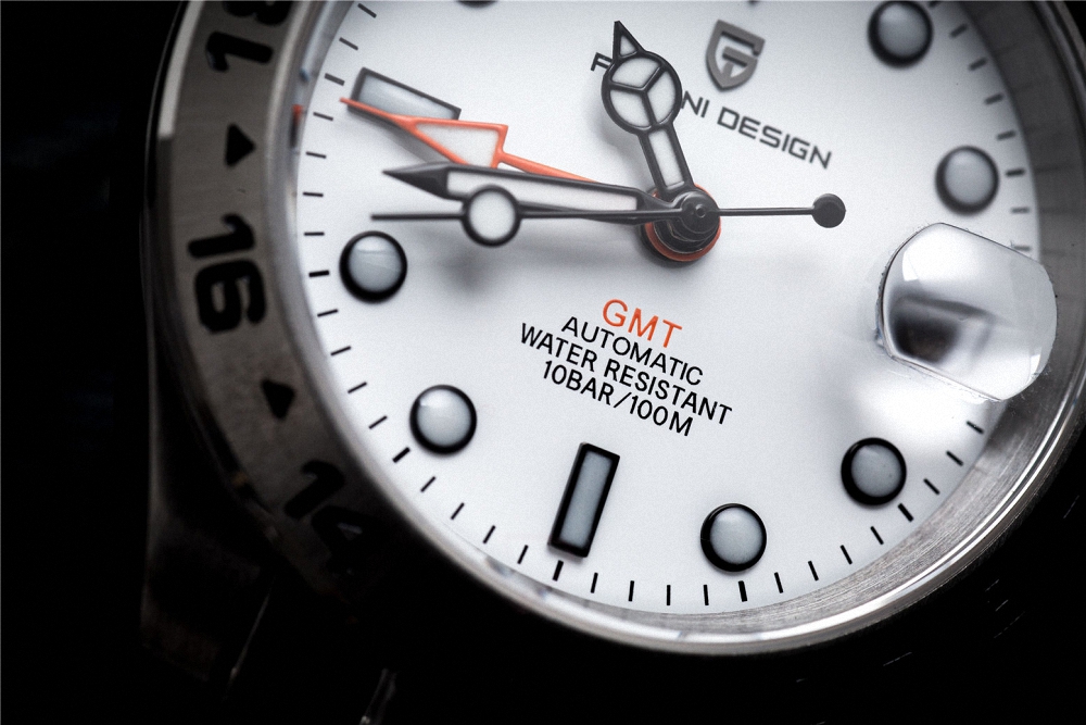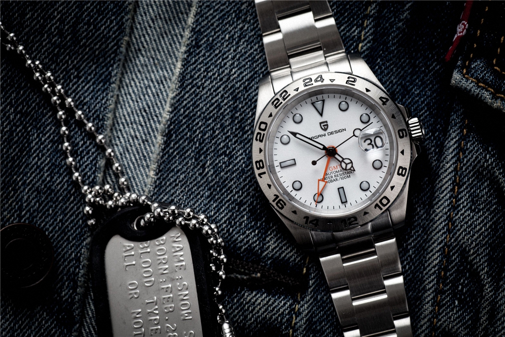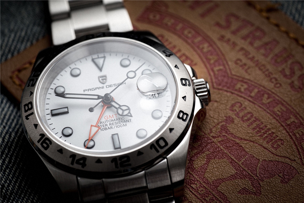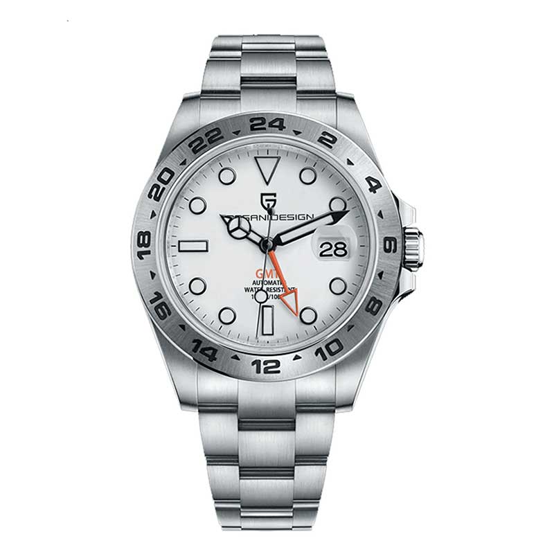 Reloj automático Pagani Design GMT estilo Explorer II, con movimiento japonés de alta precisión, cristal de zafiro resistente a rayaduras y función GMT para doble huso horario. Fabricado en acero inoxidable y con resistencia al agua de 100 metros, es la combinación ideal entre elegancia, funcionalidad y estilo deportivo.
