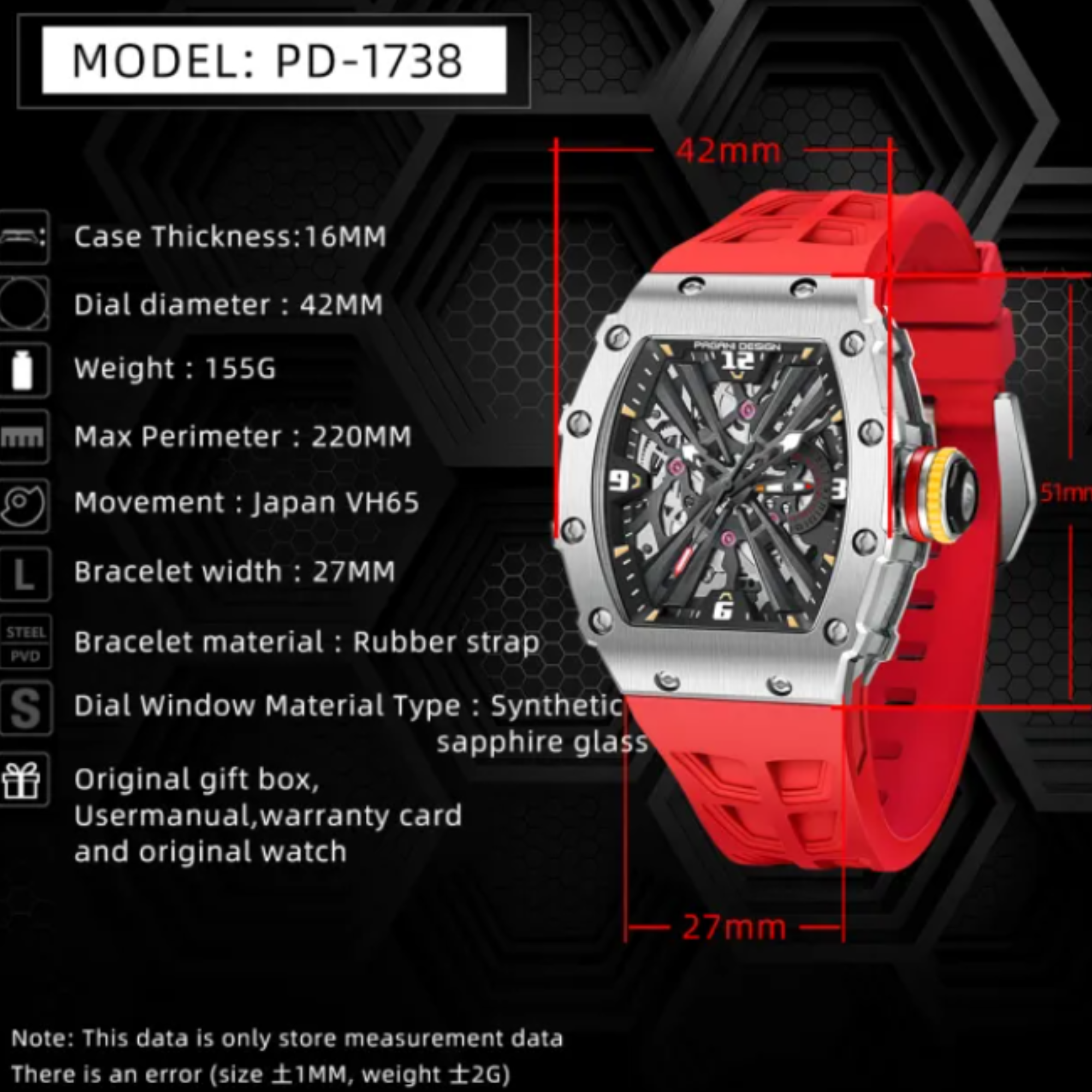 Pagani Design RM-Style es un reloj deportivo de alto impacto visual, con caja esqueletada, maquinaria automática japonesa y construcción robusta en acero y polímeros de alta resistencia. Destaca por su cristal de zafiro, resistencia al agua y diseño inspirado en los icónicos Richard Mille. Un modelo preciso, moderno y llamativo, ideal para quienes buscan estilo premium sin pagar de más.